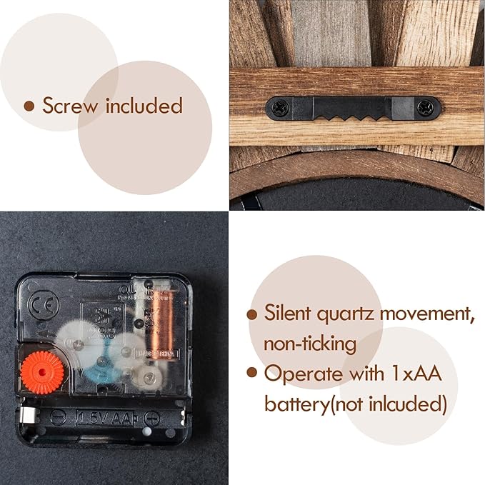 - Silent Wall Clocks: This 12 inch vintage wall clock uses a quartz movement, known for its accuracy and quiet operation, making it perfect for day and night. Honiway Wall Clock new upgrade, no need assembly, only requires 1 AA battery (not included) and comes with a screw and anchor, save your time and effort. Please note: the wall clock does not have a cover