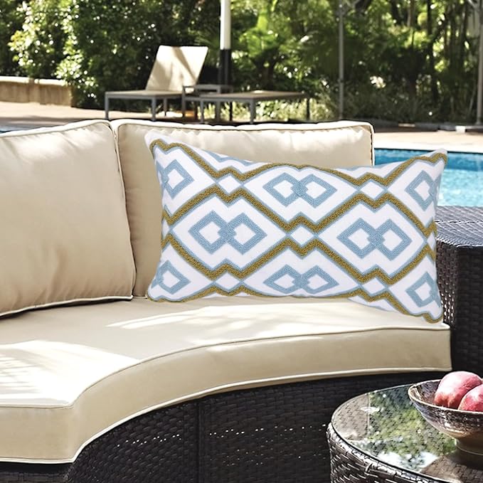 Alysheer Embroidered Lumbar Decorative Throw Pillow Cover 12"x 20", Classic Boho Geometric Embroidery Pattern Cotton Rectangular Cushion Case for Sofa Couch Living Room Bedroom (Blue Khaki)