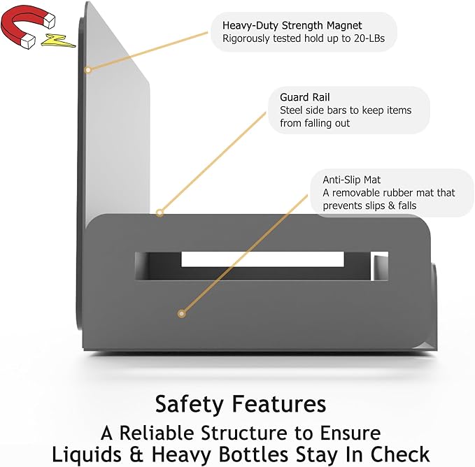 - HEAVY-DUTY MAGNETIC HOLD - Engineered with robust magnets, this magnetic shelf for fridge can securely hold up to 20 lbs, ensuring your kitchen essentials stay in place without the risk of falling