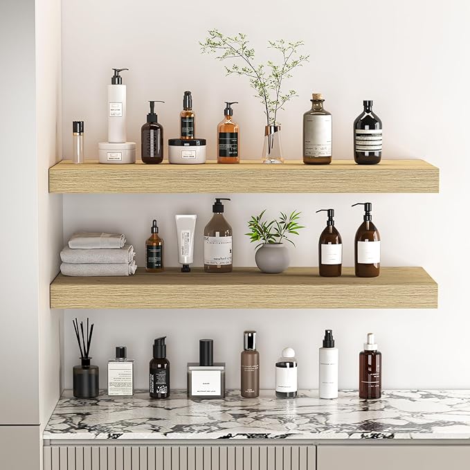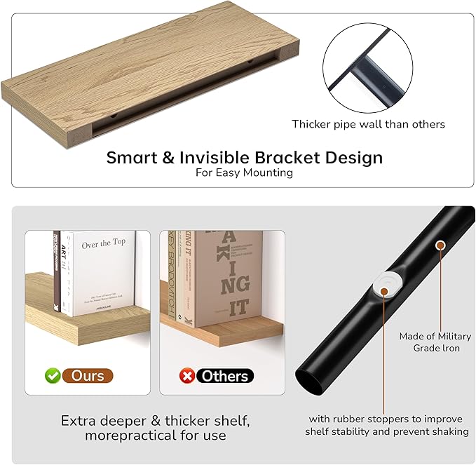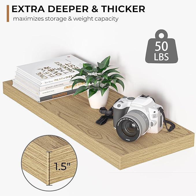 - Extra Deeper & Thicker - Each board measures 24"W x 9"D x 1.6"H. Extra deeper and thicker design in order to bring maximizes storage space and weight capacity, even hold up to 50 lb each. This floating shelf taking up zero square feet, reduces clutter and highlights décor in compact spaces.