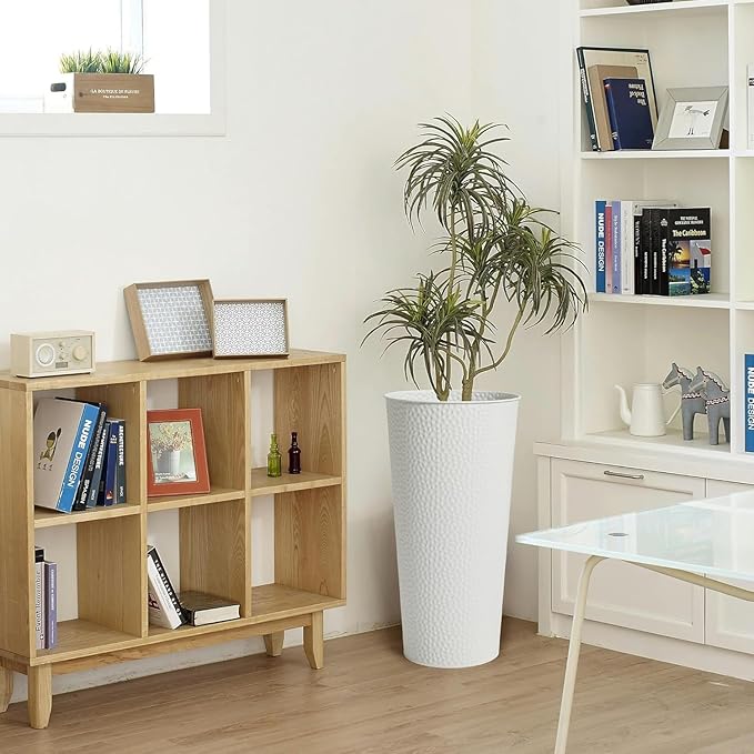 Worth Garden 2-Pack 28" H. Metal Planter with 2X Inside Pots - Hand-Hammered Texture Tall Cone Plant Pots - Large Handcrafted Flower Pot for Indoor Outdoor, Deck, Patio, Front Porch - White