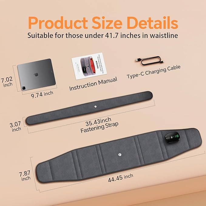 - 【Product Package and Excellent After-sales】What is in the box: waist massager, fixing belt, user manual, and Type-C charging cable (ADAPTER NOT INCLUDED). Upon purchase, you become our esteemed customer and are entitled to a 2-year after-sales service gua-rantee. [If you find any missing parts in the package or have any technical questions, please contact us via Amazon messages or the contact details in the user manual.]