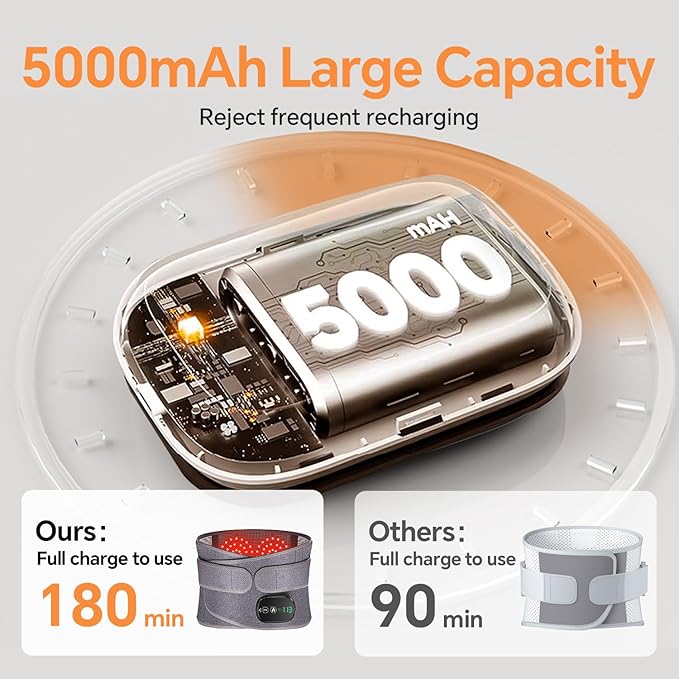 - 【180 mins Long-lasting Battery】This wrap around heating pad is equipped with a high-capacity 5000mAh battery, ensuring up to 180 minutes of continuous use. With each use ranging from 10 to 30 minutes, you can enjoy the convenience of cordless massage without the need for frequent recharging. It allows you to enjoy a comfortable massage experience anytime, anywhere.