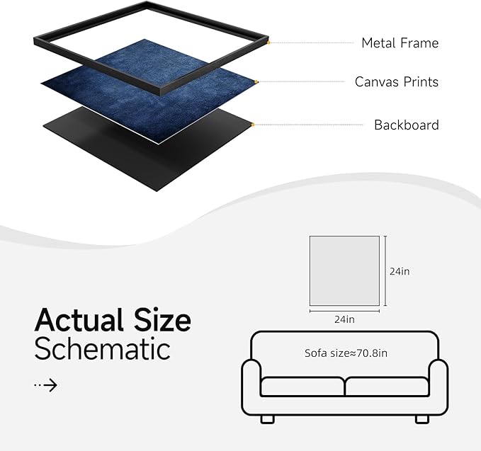 - [Framed Wall Art]: This navy blue modern abstract framed wall art measures 24x24 inches. Each painting with a solid, rust-resistant, simple and stylish black frame that blends in perfectly with a variety of decor styles.