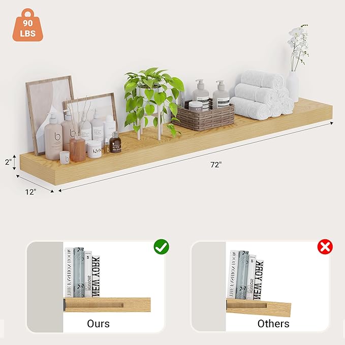 Heimlove 12 Inch Deep Floating Shelves, 72 x 12 inches Long Wall Shelf, Large Extra Display Shelf & Storage Shelf, Rustic Wood Wall Shelves for Fireplace Mantel, Oak - 1Pack