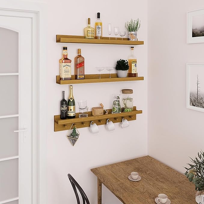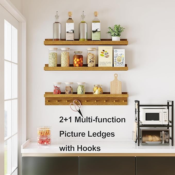 - Functional Versatility: The wooden picture ledge caters to diverse needs, accommodating books, decorations, and more, harmoniously blending aesthetics with utility. Concurrently, the wooden floating shelf with hooks transcends conventional design by conveniently hosting an array of petite items like keys and towels, expanding storage capacity.