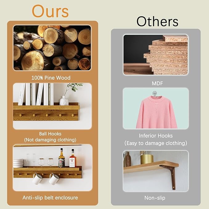 - 100% Pine Wood: Floating shelves with walnut hooks are crafted from quality wood to ensure excellent durability. Solid wood floating shelves are carefully selected to guarantee a beautiful appearance while withstanding weight and pressure, and large floating shelf with lip provide more storage space.