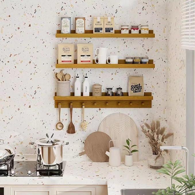 MBYD Floating Shelves 36 Inch, Nursery Book Shelves for Kids Room, Hanging Bookshelf with Hooks Set of 3, Light Walnut Wood Picture Ldge Shelving, Kitchen Wall Shelf Spice Rack for Bedroom Bathroom