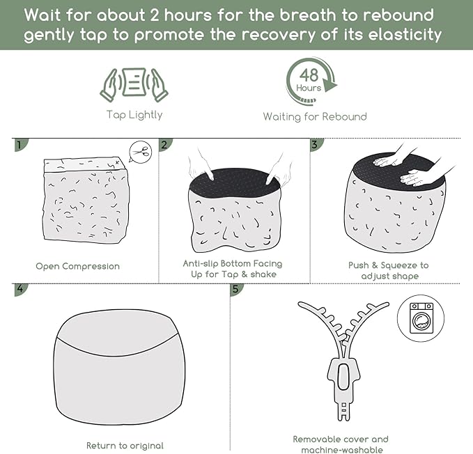 - For convenience and ease of use, this pouf ottoman comes pre-filled with memory foam chunk pouf filler, which can be easily inserted through the large round opening on the bottom with double zippers.