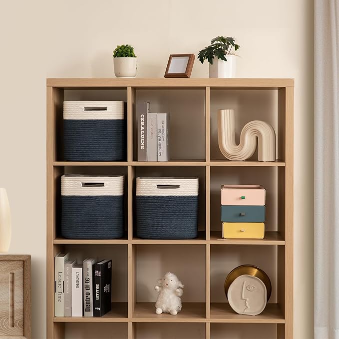 OIAHOMY Cube Storage Basket, 3-Pack Woven Cotton Rope Baskets for Storage, 11-Inch Cube Basket with Handles, Great for Shelves, Closets, Children's Toy Storage and Organization-White & Blue
