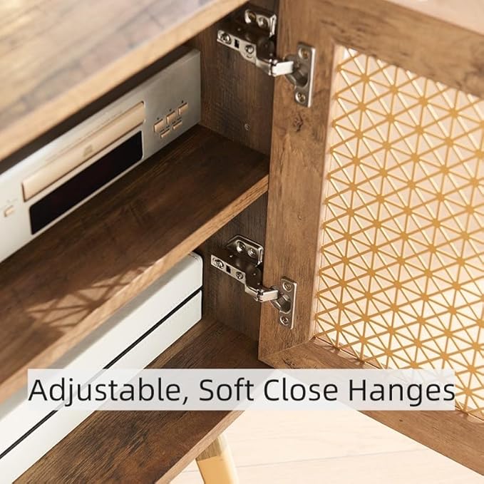 - Attractive Style: Mid-century modern TV stands combine fashionable metal elements with vintage wooden look. Its eye-catching golden metal mesh doors and stylish handles add a unique charm to your living room furniture. This TV console is perfect for a variety of decor styles