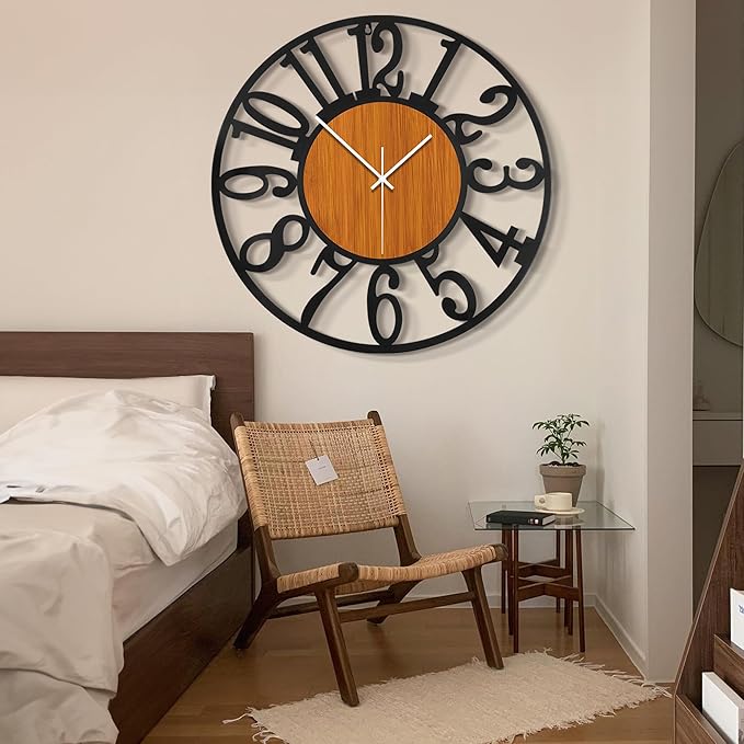- [Quality Hndmade Clock] -The large black metal clock has a wood face-out retro design. The strength and retro appearance of the Big Number wall clock are ensured by the use of high-quality 2cm thicker handmade iron materials in the handcrafted, metal frame and showing the wooden face.