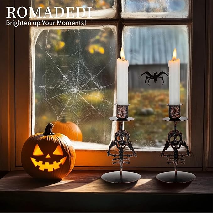 Romadedi Candle Holder for Halloween Decor: Set of 2 Black Gothic Skull Taper Candlestick Table Centerpiece Decorations Spooky Party Dinning Room Home Indoor