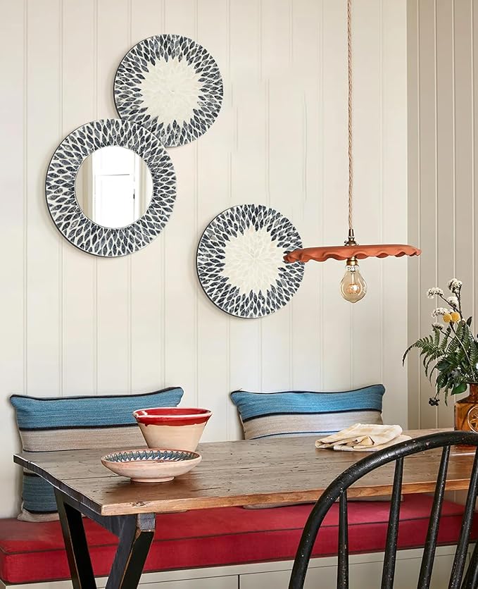 - HANDMADE, NATURAL WALL DECOR - Handcrafted from real mother of pearl by our experienced craftsmen, this unique mirror wall art set adds distinctive flair to your living or working space. Its timeless design fit in modern, electric, industrial, rustic and any other styles nicely, bringing texture and interest to your rooms. [Note: Because the cut pieces are put on individually by hand, items received may be slightly different from pictures shown]