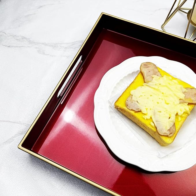 - Design: The size of the Emerald Red tray is 15.7 x 11.8 inches, and it has two built-inhandles for easy carrying. lt has asimple, solid color finish with agolden top rim accent, and theedges are relatively smooth.