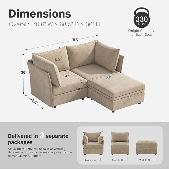 - 💡 Stylish and Spacious Sectional Sofa - A blend of modern elegance and comfort, this beige sofa is ideal for contemporary interiors. Customize seating and shape by adding or removing modules to fit your needs. It's perfect for your living room, family room, bedroom, or office. Overall size: 70.6" W × 68.5" D × 36" H, seat width: 32", seat depth: 24.5".