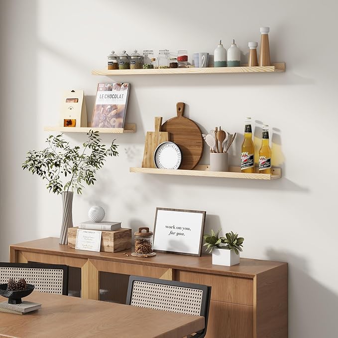Picture Ledge Shelf for Wall, 36 inches Solid Pine Wood Nursery Book Shelves 3 Packs, Floating Ledge Shelves for Kids' Room Bedroom Bathroom Living Room Photo Frames Office Nursey Wall Decor, Natural