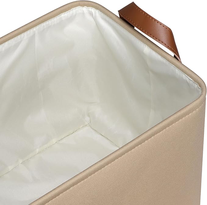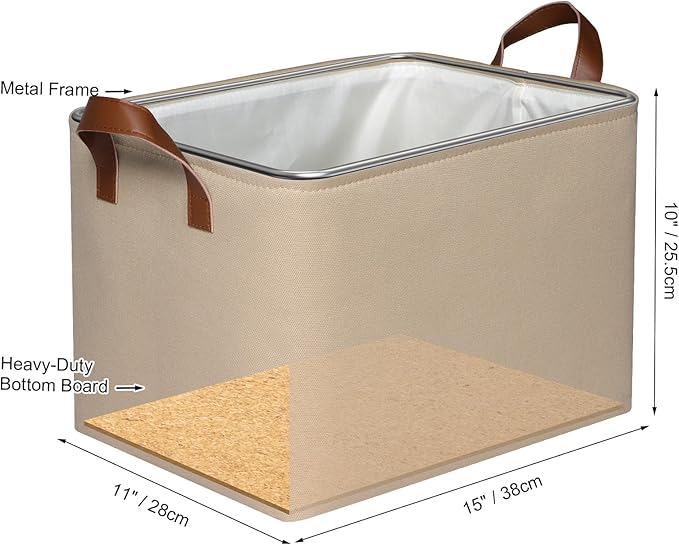 - 【Sturdy Construction】Our storage baskets for shelves are reinforced with upper metal frame and fiberboard bottom to keep basket shape and upright. With the 2 leather handles securely sewn to the sides of the fabric bins, provides a comfortable grip while ensuring that you can easily carry items without tearing the handles.