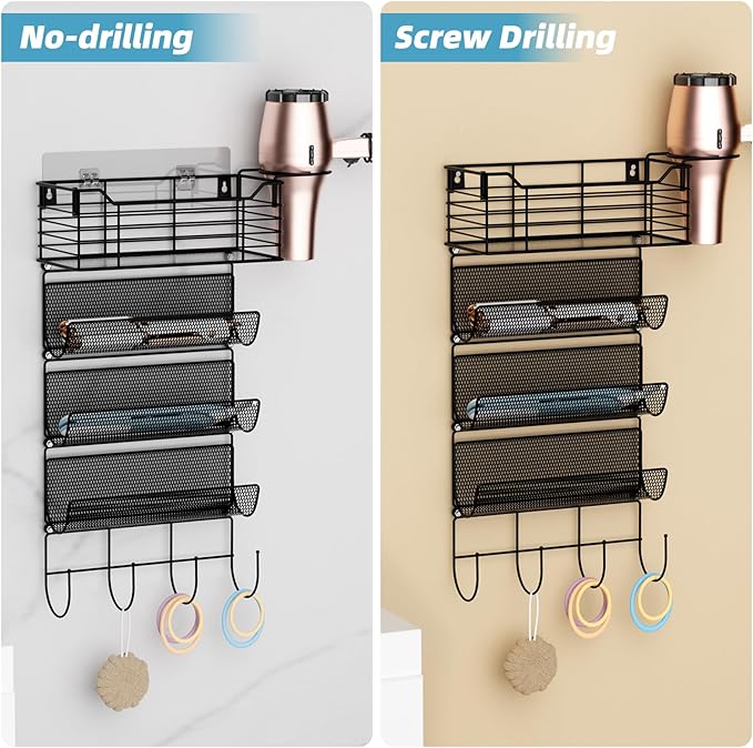 - 【Easy to Install/Use】The hair tool organizer can be hung in 2 ways: 1.Drilling screws make the hair tool rack fixed more firmly; 2.Intasll with the adhesive hook to protect the wall from damage.