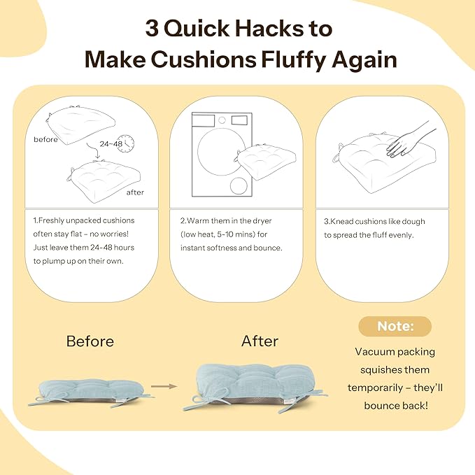 - Large Size Design: Our kitchen chair cushions set of 4 measures 18" x 18" x 3", perfect for most dining chairs, kitchen chairs, and office chairs, instantly transforming hard seats into cozy, stylish seating solutions for any room. The chair cushions for dining chairs are vacuum-packed for shipping. Upon receiving them you can simply follow the easy steps to fluff it for optimal comfort.