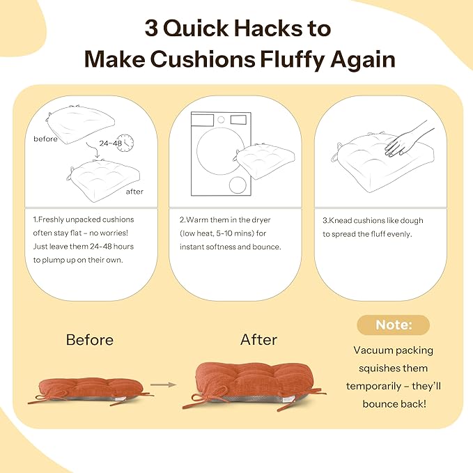 - Large Size Design: Our kitchen chair cushions set of 4 measures 18" x 18" x 3", perfect for most dining chairs, kitchen chairs, and office chairs, instantly transforming hard seats into cozy, stylish seating solutions for any room. The chair cushions for dining chairs are vacuum-packed for shipping. Upon receiving them you can simply follow the easy steps to fluff it for optimal comfort.