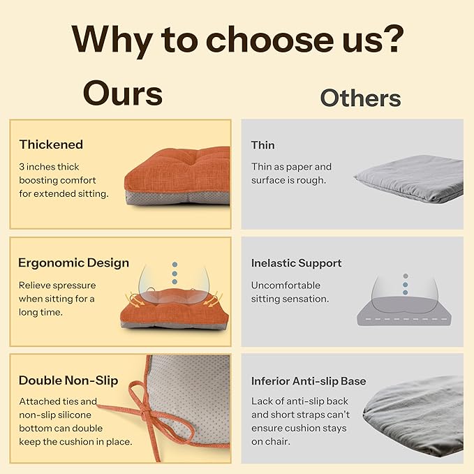 - Enhanced Support & Premium Filling: Our dining room chair cushions offer double the comfort with high quality cotton filling that offers superior comfort and support, relieving pressure on your hips and tailbone during extended seating. The chair cushions are tufted to prevent foam clumping. Perfect for extended sitting whether at the desk or dining table it combines comfort with ergonomic support.