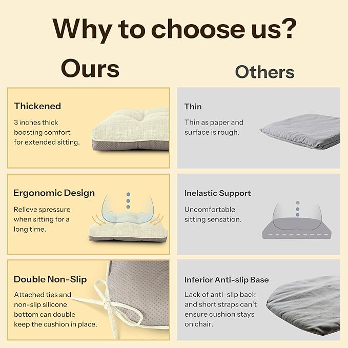 - Enhanced Support & Premium Filling: Our dining room chair cushions offer double the comfort with high quality cotton filling that offers superior comfort and support, relieving pressure on your hips and tailbone during extended seating. The chair cushions are tufted to prevent foam clumping. Perfect for extended sitting whether at the desk or dining table it combines comfort with ergonomic support.
