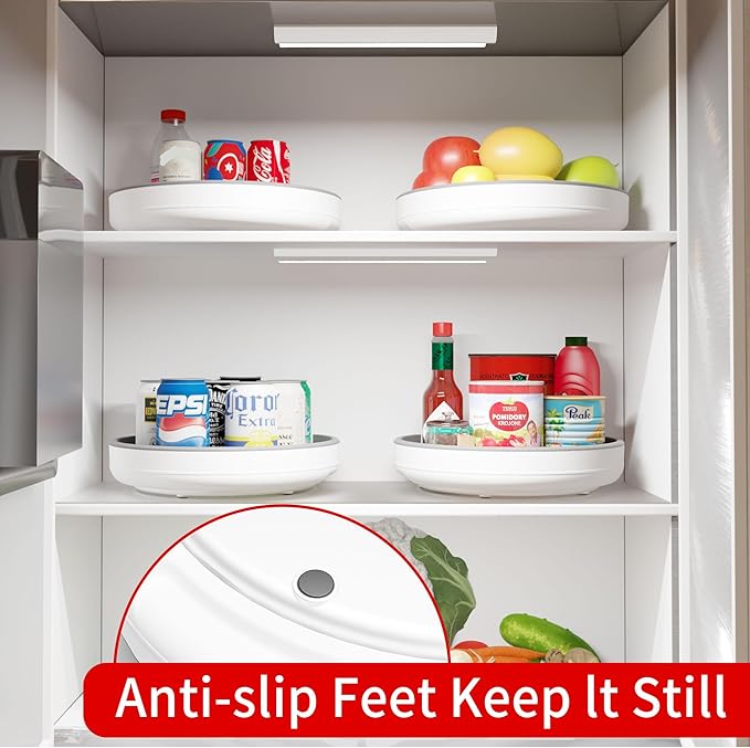 - Package Include: 4 Pack 10 Inch lazy susan organizer. Easily rotating plastic lazy susan turntable for pantry organizers and storage includes non-skid beaded surfaces with anti-slip base feet