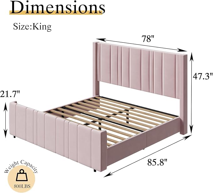 - Easy Assembly & Color: Assemble in 2 hours using provided hardware and clear labeled parts; For this king velvet upholstered bed frame, 2 adults assemble recommended. Please note that velvet fabrics vary in color in different lights