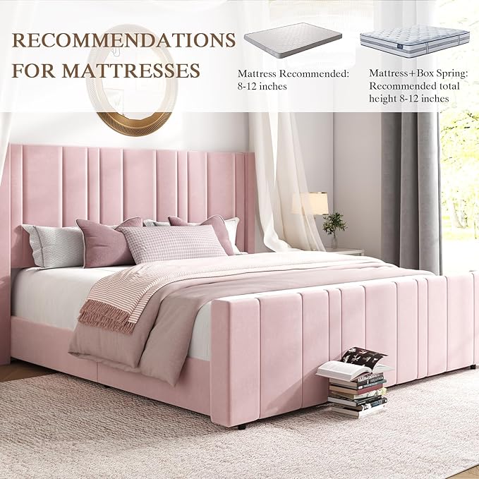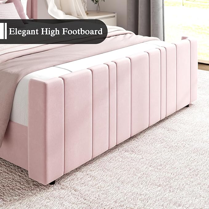 - Sturdy and Cozy: With the solid construction, the pink bed frame enhances safety and comfort. The upholstered headboard provides excellent support for relaxing and sleeping. Kids and pets friendly, beautiful and soft to the touch