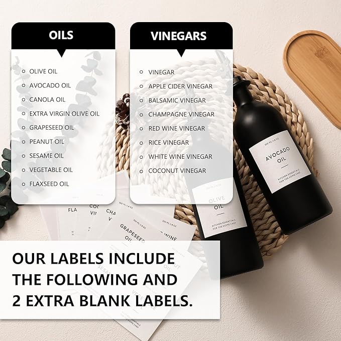 - KITCHEN ESSENTIAL - Worthy of sitting on your kitchen counter, The oil bottle for kitchen with label which can help you identify them easily, both decorative and practical, this cooking oil dispenser not only kitchen oil dispenser bottle, but also black and white kitchen décor.