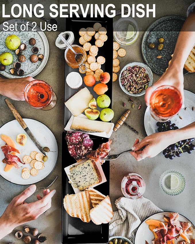 Long Melemine Serving Tray, 17.3x8x1.5 in Serving Platters and Trays for Appetizer, Charcuterie, Bread, Fruit, Dessert, Set of 2, Black