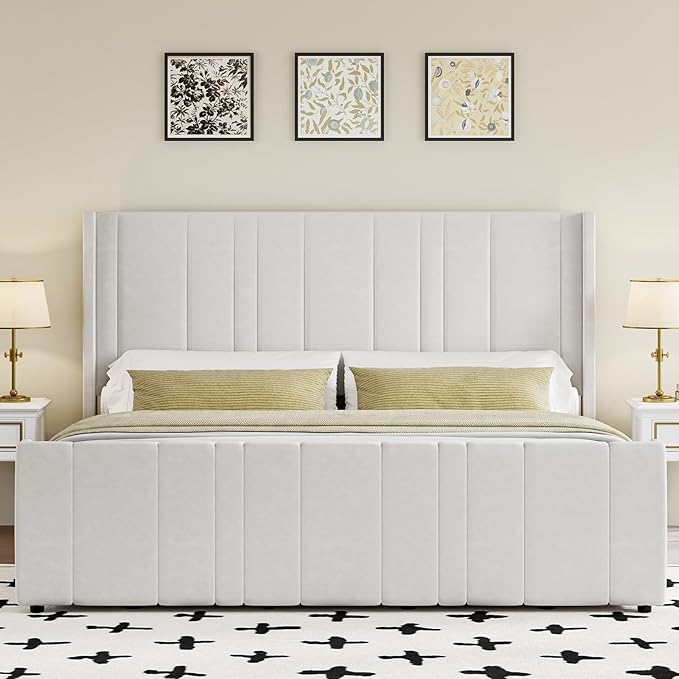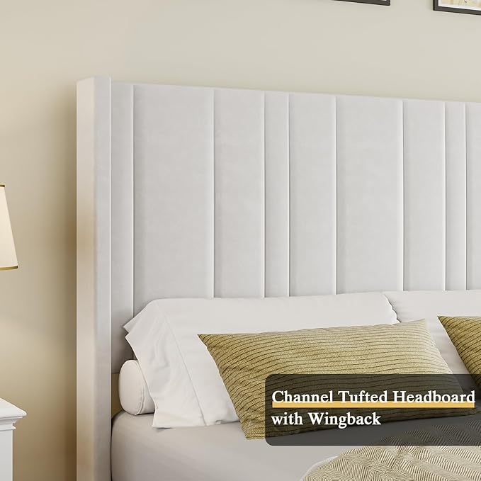 King Size Bed Frame and Headboard, Soft Velvet Upholstered Bed Frames with Vertical Channel Tufted Wingback Headboard & Footboard, Soft Bed Frame King, Noise Free, Easy Assembly, White