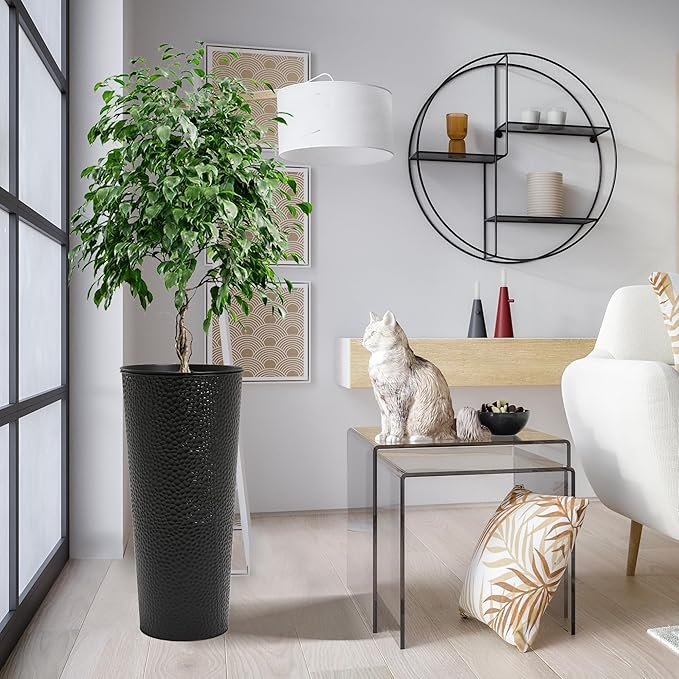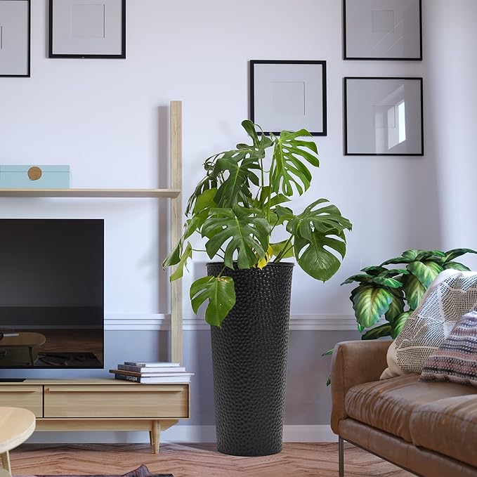 Worth Garden 2-Pack 28" H. Metal Planter with 2X Inside Pots - Hand-Hammered Texture Tall Narrow Tapered Plant Pots - Large Handcrafted Flower Pot for Indoor Outdoor, Deck, Patio, Front Porch (Black)