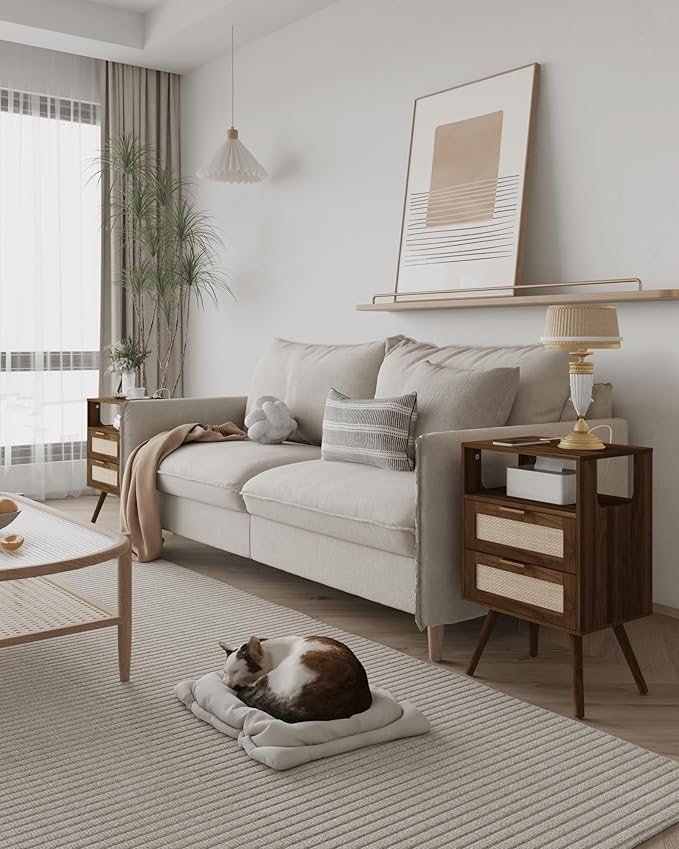 - Embrace the farmhouse touch: A classic Walnut Brown with rattan face, this nightstand gives off a farmhouse touch in your bedroom. With a row insert makes it more practical, the atmosphere lamp is a good addition to the fun of life, it can also be used as a side table or coffee table for the whole family to attract attention, adding elegance to family life.