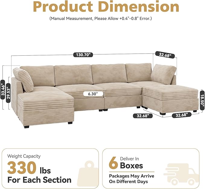 Modular Sectional Sofa, 130.7 Inch U Shaped Couch Set for Living Room, 4-Seater Comfy Cloud Couches with Two Movable Ottoman, DIY Combination, Plush Corduroy, Beige