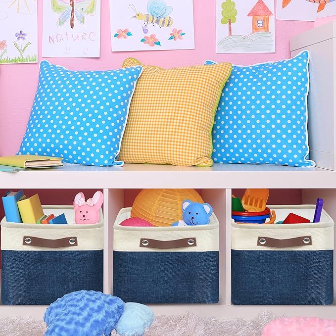 SIMPLE HOUSEWARE Large Fabric Storage Bin, 15" x 11" with Leather Like Handles, 3 Pack, Steel Blue