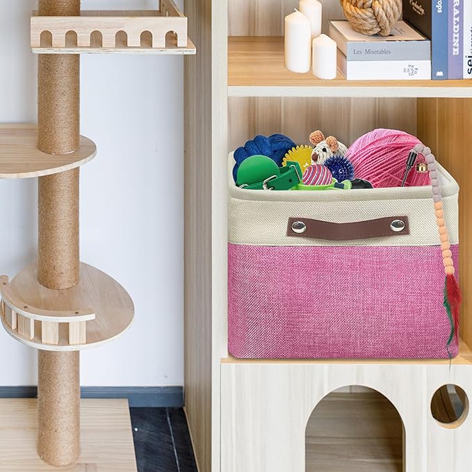 SIMPLE HOUSEWARE Large Fabric Storage Bin, 15" x 11" with Leather Like Handles, 3 Pack, Pink