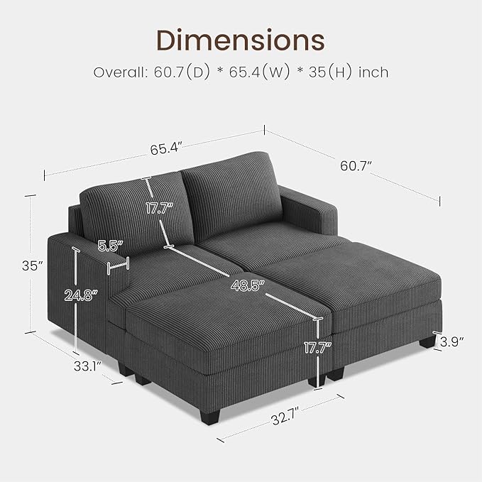 - Sectional Size: Overall dimensions are 60.7" (D) x 65.4" (W) x 35" (H), with a weight capacity of 330 lbs per seat. The sleeper area measures 93.8" x 48.5"