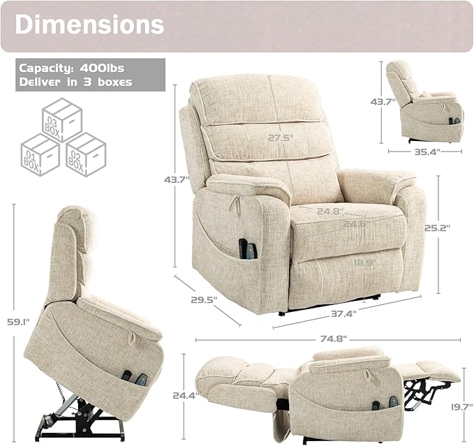 - 【Extended Footrest】This is a upgraded power lift recliner. We have extended the footrest so that you can stretch your body at full length and still have your feet well supported without cutting off circulation. Overall size: 37.4"D x 35.54"W x 43.7"H. Heavy duty steel mechanism is designed to support up to 400lbs. Suitable for big and tall people.