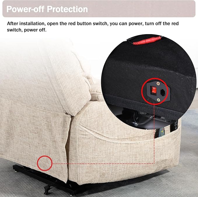 - 【Power Outage Protection Device】 When you don't need to use the chair, you don't need to unplug the power plug, just turn off the power switch on the base at the back of the chair to achieve the power-off effect.