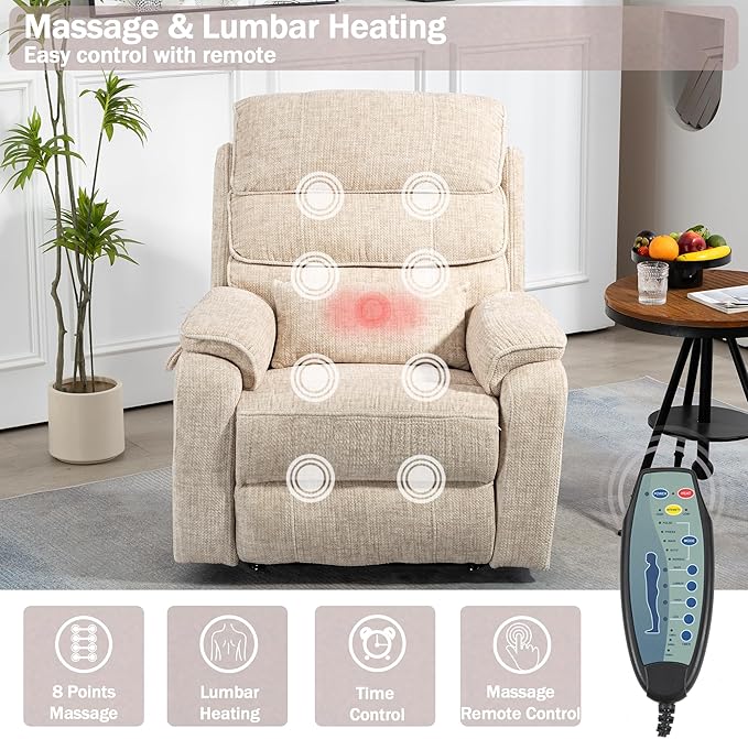 - 【Massage and Heating】This electric recliner is specially designed with 8 vibrating points massage (back/lumbar/thighs/legs), lumbar heating function is good for waist pressure relief and blood circulation, taking away the stress and tiredness. The timer function in 15/30/60 minutes which is convenient for you to set massaging time. Own this lay flat recliner chair, you can have a full body massage at home.