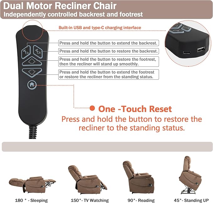 - 【Convenient Home Button, USB and Type-C Charger】We upgraded the remote control to make our chair more convenient to operate. The new remote control is equipped with USB port and Type-C charging interface and a Home button. Simply press and hold the Home button to reset the chair to a standing position within 15 seconds. You can release the button at any time to keep the chair in the position you need.