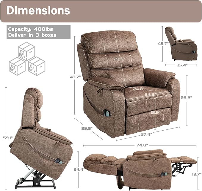 - 【Extended Footrest】This is a upgraded power lift recliner. We have extended the footrest so that you can stretch your body at full length and still have your feet well supported without cutting off circulation. Overall size: 37.4"D x 35.54"W x 43.7"H. Heavy duty steel mechanism is designed to support up to 400lbs. Suitable for big and tall people.