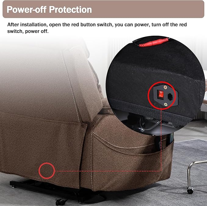 - 【Power Outage Protection Device】 When you don't need to use the chair, you don't need to unplug the power plug, just turn off the power switch on the base at the back of the chair to achieve the power-off effect.