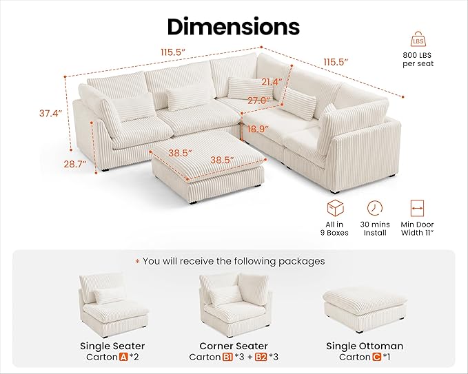 - 【Shipped in Nine Packages for Easy Setup】To enhance your convenience, the sectional will be delivered in nine packages, allowing for easier handling and assembly. Each package is carefully packed to ensure safety during transit, and while they may arrive at different days, rest assured that our professional customer service is ready to assist you with any concern. The thoughtful design makes the setup process simpler and more efficient,ensuring you enjoy your sectional without any hassle