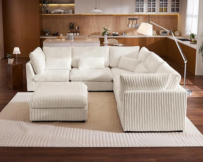 Oversized Modular Sofa, Extra Deep Cloud Corduroy Sectional Couch with Ottoman Chaise, Fluffy Chenille Corner V Shape Sofa for Living Room, Villa (Corner V Shape+Ottoman, Corduroy White)