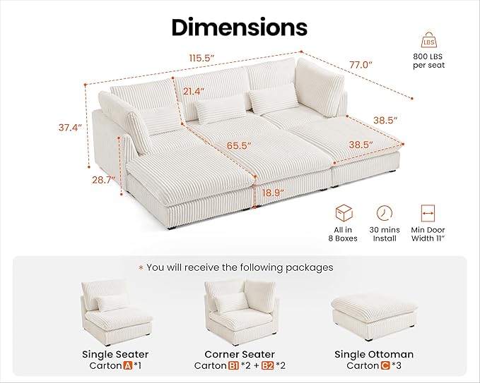 - 【Shipped in Eight Packages for Easy Setup】To enhance your convenience, the sectional will be delivered in eight packages, allowing for easier handling and assembly. Each package is carefully packed to ensure safety during transit, and while they may arrive at different days, rest assured that our professional customer service is ready to assist you with any concern. The thoughtful design makes the setup process simpler and more efficient,ensuring you enjoy your sectional without any hassle