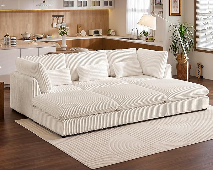 Oversized Modular Sofa, Extra Deep Cloud Corduroy Sectional Couch with Ottoman Chaise, Fluffy Chenille 6 Seater Couch Bed for Living Room, Villa (Sofa Bed 6 Seater, Corduroy White)