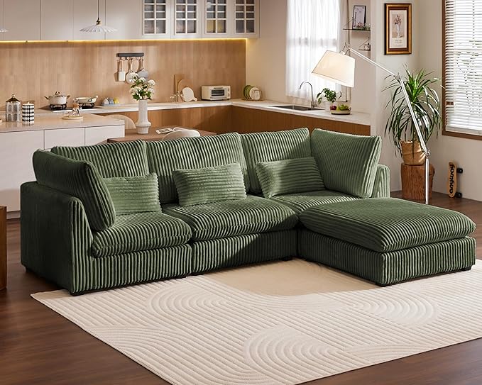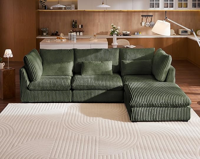 Oversized Modular Sofa, Extra Deep Cloud Corduroy Sectional Couch with Ottoman Chaise, Fluffy Chenille 4 Seat L-Shaped Sofa for Living Room, Villa (L Shape 4 Seater, Corduroy Green)